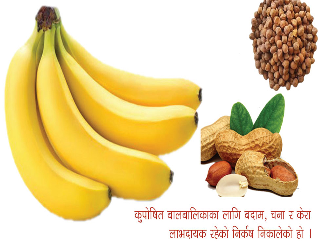 २०७६ मङ्सिर १२ : बदाम, चना र केरा। सस्तो र सरल रुपमा प्राप्त गर्न सकिने यी तीन चिजले कुपोषित बच्चाको स्वास्थ्यमा सुधारात्मक परिर्वतन ल्याउँछ।