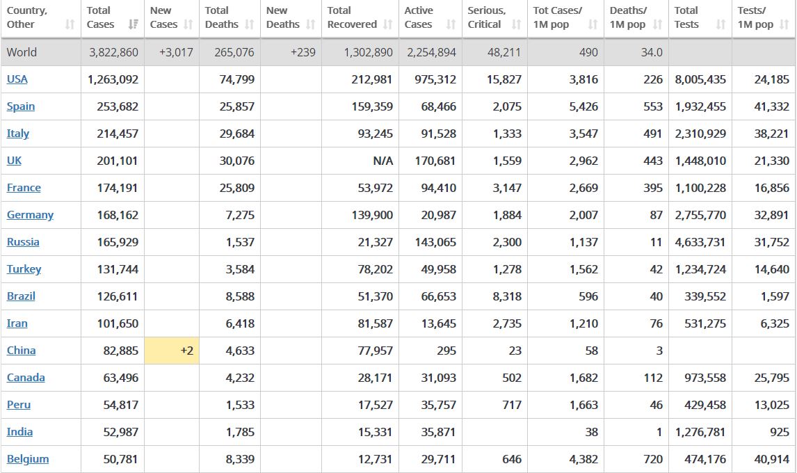 विश्वका २१२ मुलुक र २ वटा पानीजहाजमा फैलिएको यो भाइरसबाट यो समाचार तयार पार्दासम्म ३८ लाख २१ हजार ९१७ जना संक्रमित छन् ।