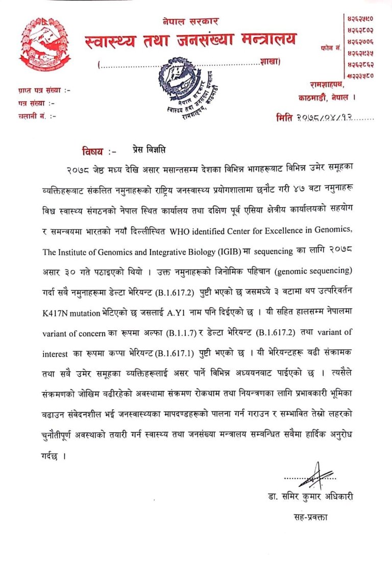 जेठ मध्यदेखि असार मसान्तसम्ममा विभिन्न उमेर समूहका व्यक्तिहरुबाट संकलित नमूनामध्येबाट ४७ वटा नमूना परीक्षणका लागि दिल्ली पठाइएको र सबै नमूनामा डेल्टा भाइरस पुष्टि भएको मन्त्रालयले जनाएको छ ।