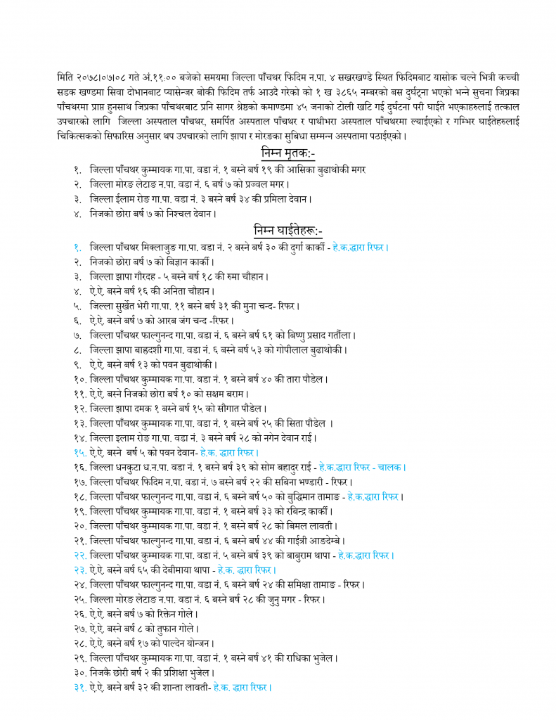 बस दुर्घटना अपडेट: मृतक तथा घाइतेहरूको पूरा विवरण सहित ९ कार्तिक २०७८, मंगलवार १२:४२ नँया कुराे समाचार ।।पाँचथरमा हिजो भएको बस दुर्घटनामा मृत्यु भएका तथा घाइतेहरूको पूरा विवरण यश प्रकार रहेको छ ।