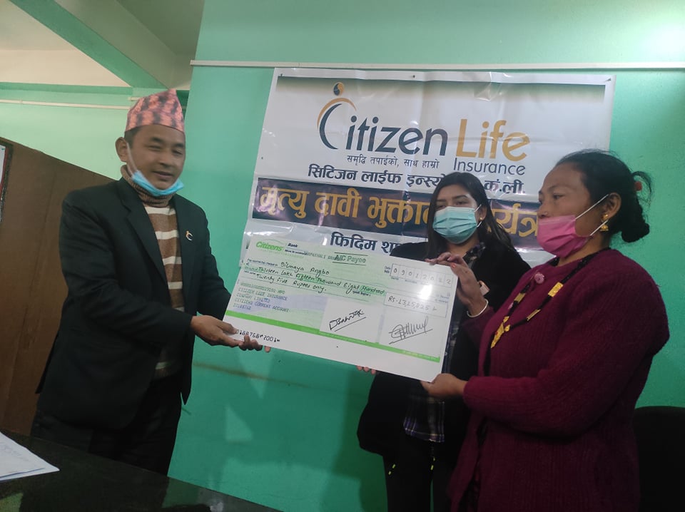उक्त विमा बापत बिमांक रकम १० लाख, किरिया तथा अन्य खर्च १ लखा, अस्तु स्वदेशमा ल्याएको खर्च १५ हजार ८ सय २५ र आयको नोक्सानी बापतको रकम २ लाख रुपैया गरी कुल प्राप्त हुने १३ लाख १५ हजार ८ सय २५ रुपैया रकम सिटिजन लाइफ इन्स्योरेन्स पाँचथर शाखाका शाखा प्रवन्धक राम लावतीले मृततकी श्रीमती दिलमाया आङबोलाइ हस्तानतरण गरेका हुन् ।