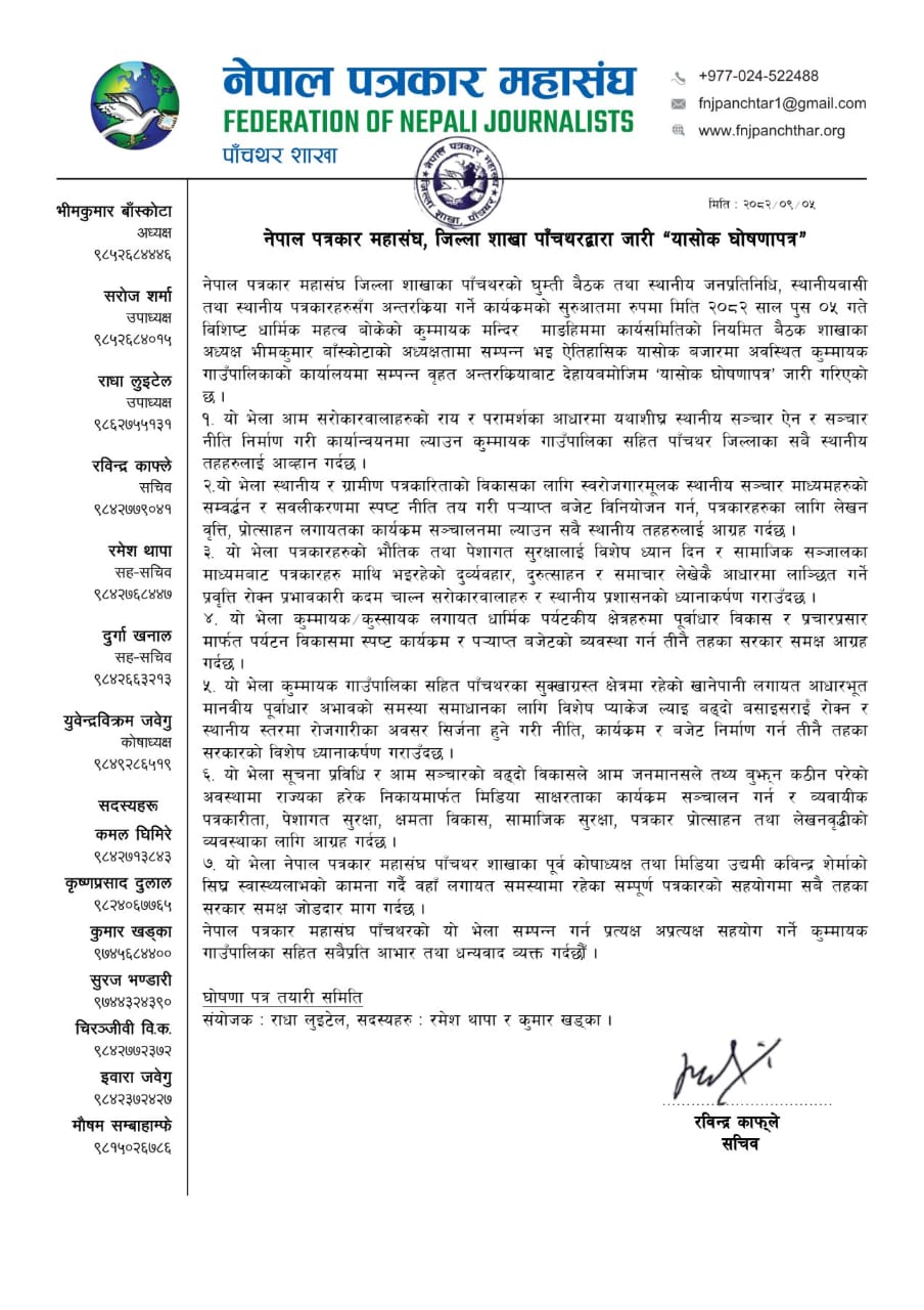 अन्तरक्रियापछि महासंघ पाँचथर शाखाले ७ बुदे घोषणा पत्र जारी गर्दै स्थानीय तहमा सञ्चार नीति कार्यान्वयन, पत्रकारमैत्री वातावरण निर्माण र पत्रकारको क्षमता अभिवृद्धिमा स्थानीय सरकारको सक्रिय भूमिका आवश्यक रहेको उल्लेख गरेको छ।